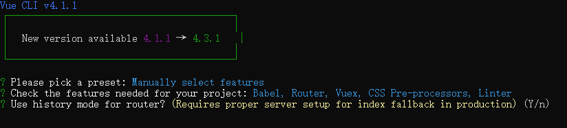 这里是询问是否使用 router 的 history 模式,如果选择是,在生产环境中,服务端需要为索引回退做适当的配置。这个对我们的 demo 没有影响,同样按enter使用默认选项。