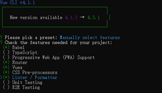 这里是选择代码检查工具,选择 ESLint + Prettier。因为 Prettier 不仅可以格式化js代码,还可以格式化 css 和 vue模板文件中 template 部分的代码。